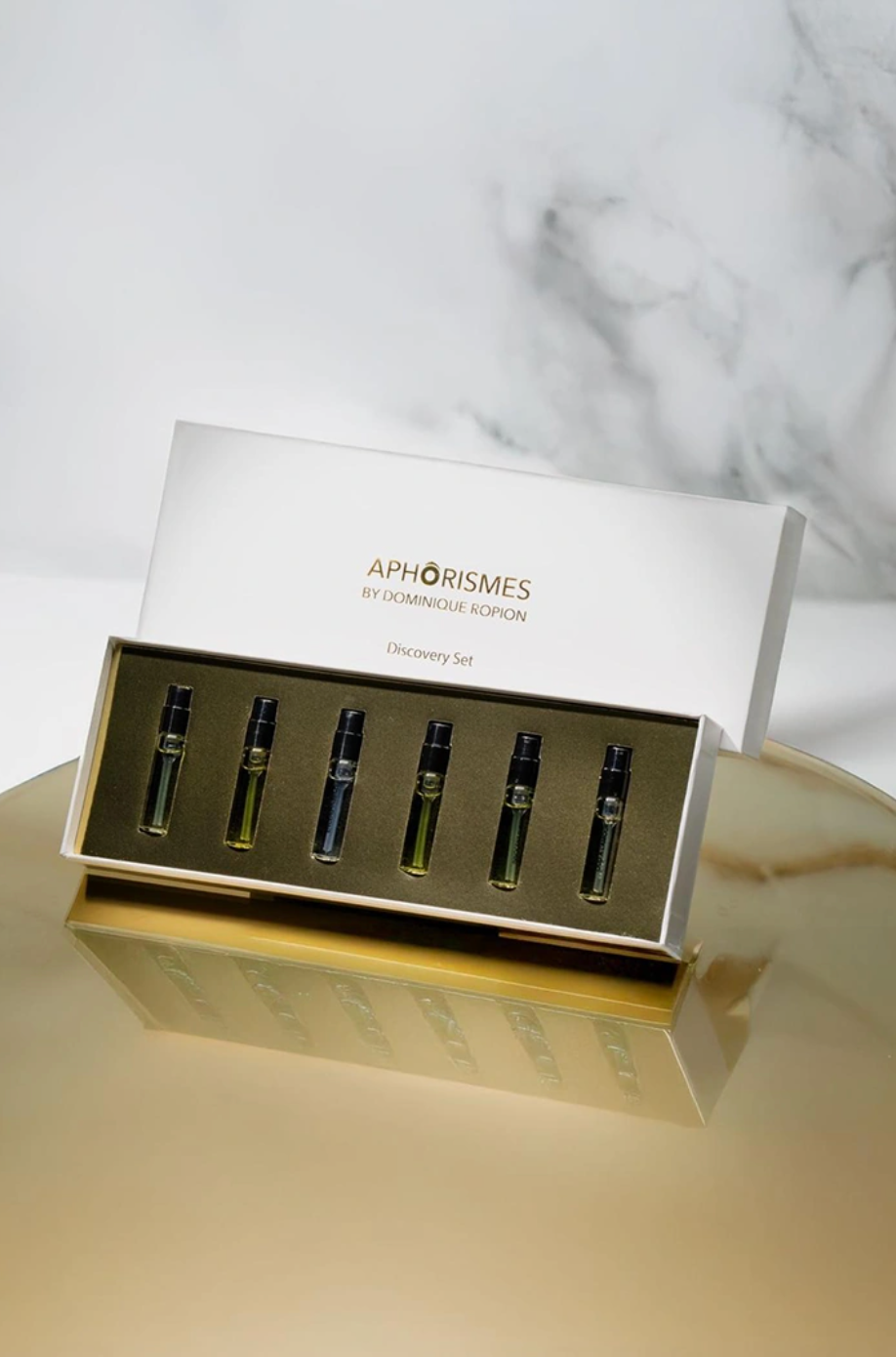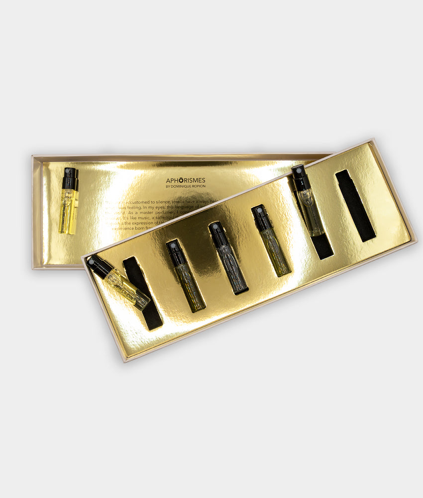 Discover the complete collection of Aphorismes by Dominique Ropion in this set that includes samples of Crazy Garden, Oud a l'Amour, Innocent Tuberose, My Clementine, A Rose is a Rose and Encens Insense.